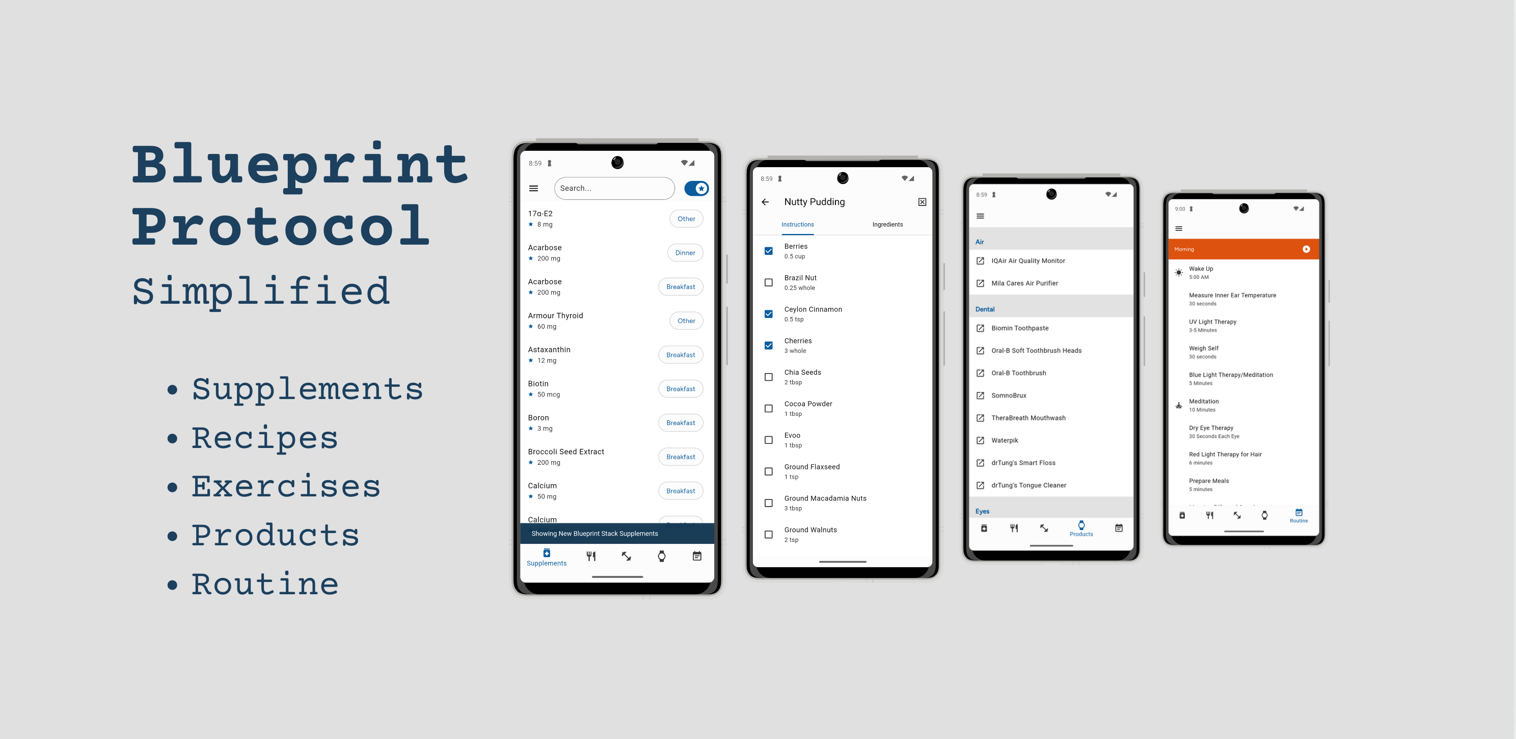 Bryan Johnson’s blueprint protocol, simplified. Supplements, recipes, exercises, products, and routines in one place without the clutter.