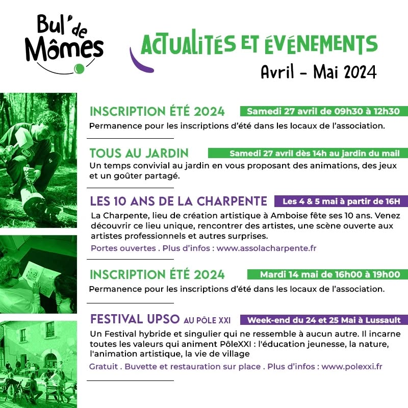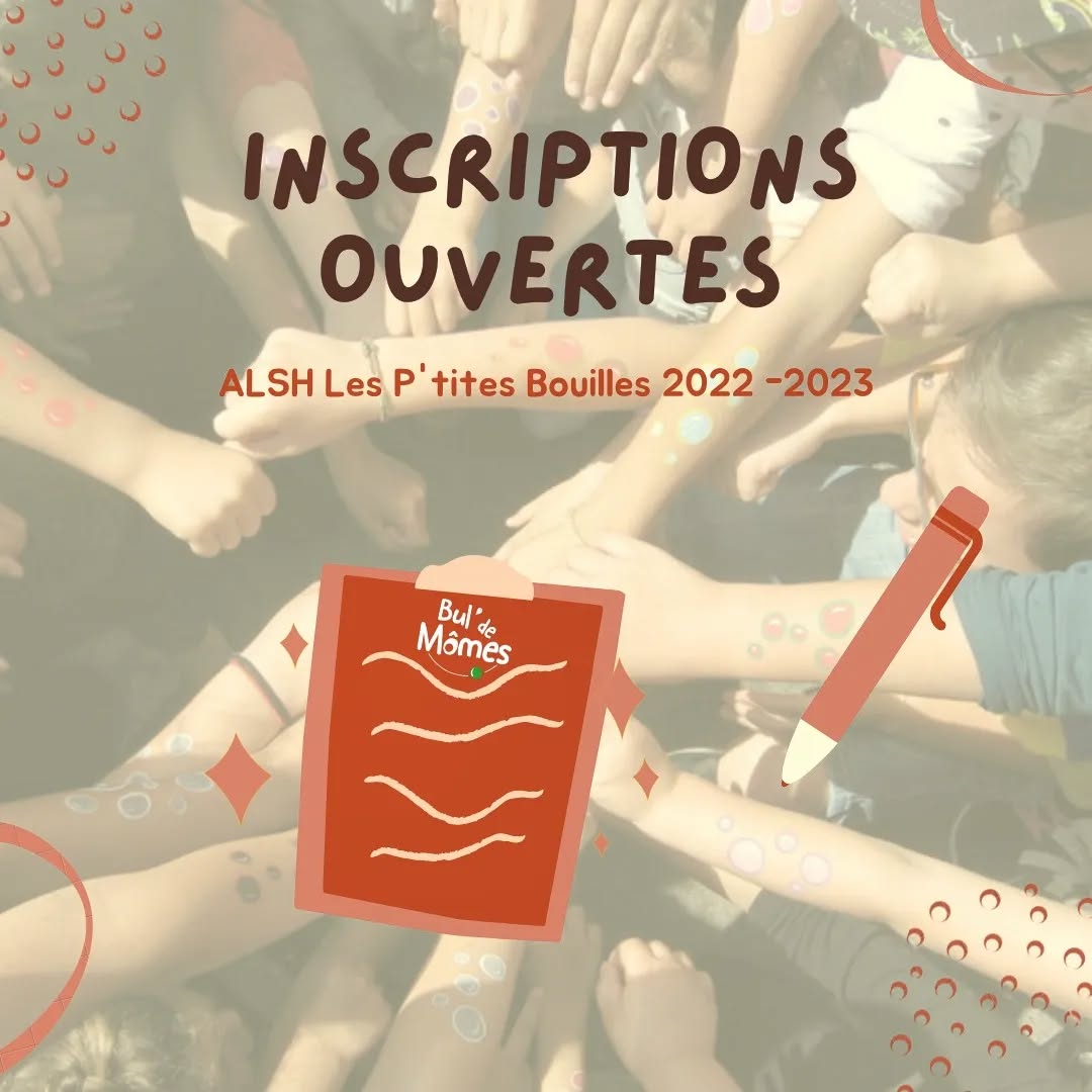 Pour inscrire vos enfants à l'accueil de loisirs pour les vacances scolaire (sauf pour les vacances d'hiver, nous sommes fermé) ou au périscolaire les P’tites Bouilles envoyer simplement un mail à secretariat@buldemomes.fr / periscolaire@buldemomes.fr
