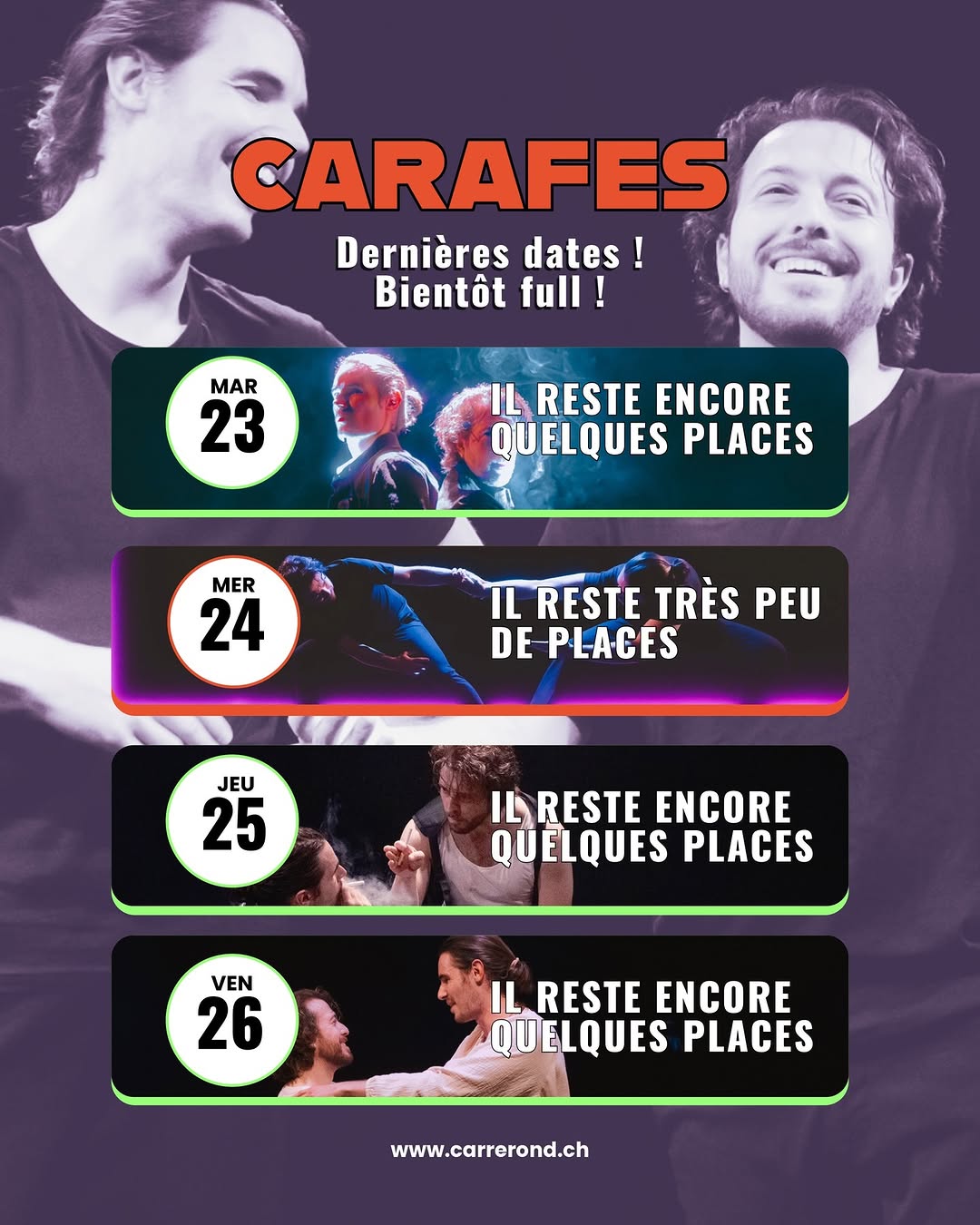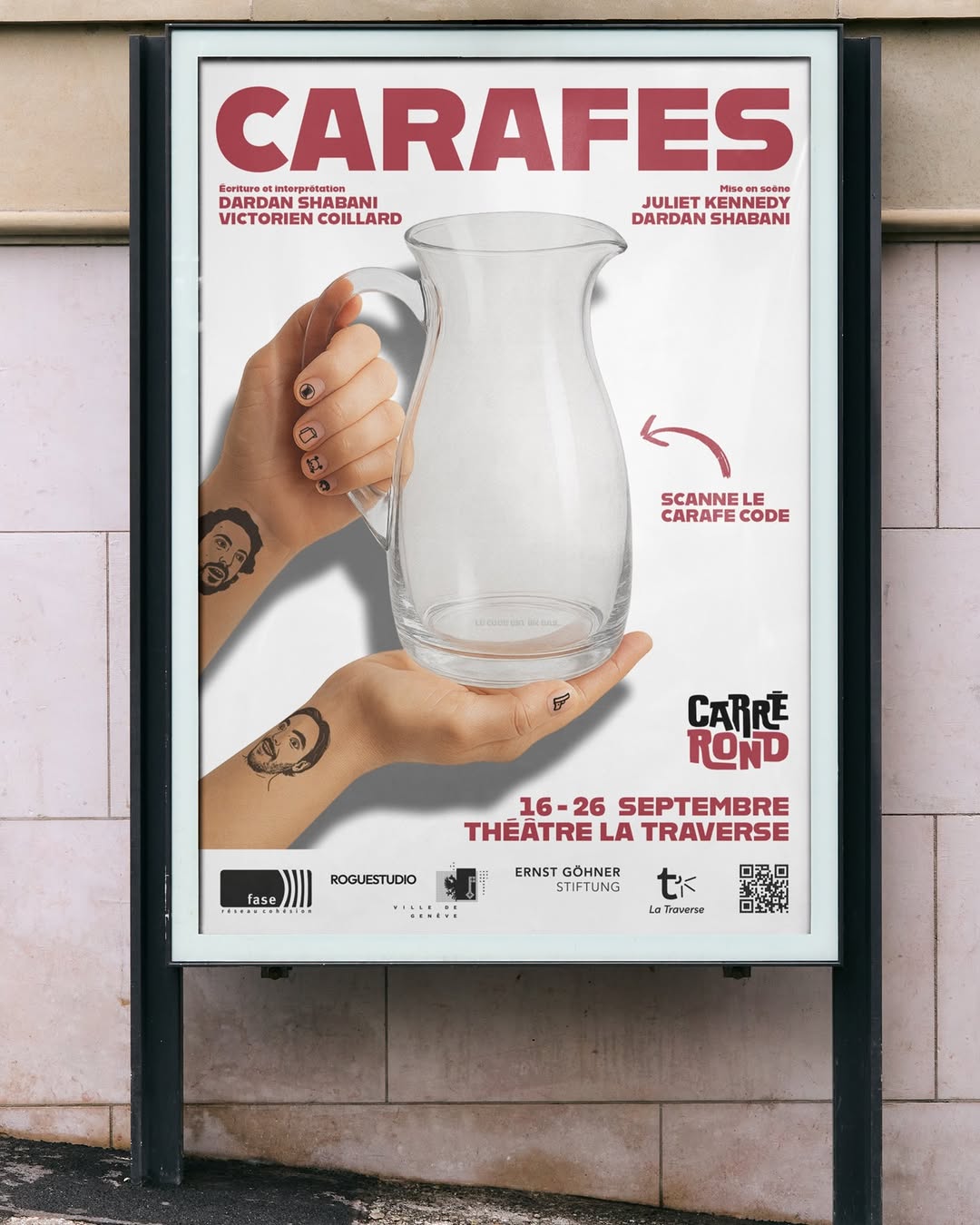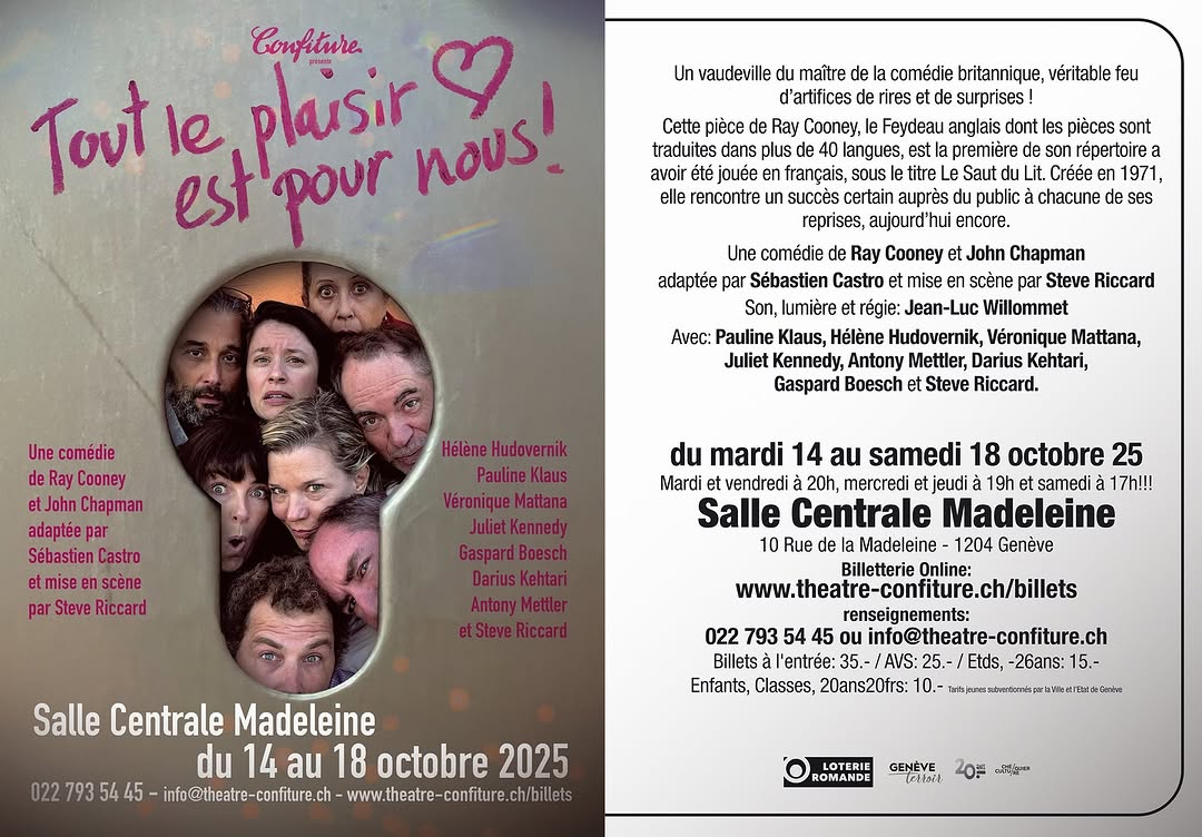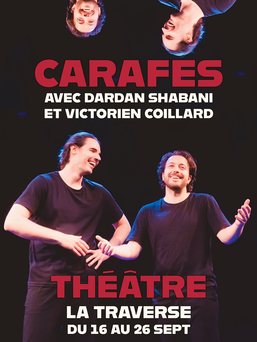 Théâtre Genève "CARAFES Par Cie Carré Rond Synopsis : Carafes c’est une comédie absurde en 13 tableaux, où l’humour naît de la gêne et des petits flottements du quotidien. Deux personnes traversent des situations où tout vacille : malaises, silences, maladresses et pertes de contrôle. Chaque tableau propose un regard drôle et décalé sur ces moments universels où l’on ne sait plus très bien où se mettre. Interprétation : Dardan Shabani et Victorien Coillard Mise en scène : Juliet Kennedy Théâtre La Traverse Rue de Berne 50, 1201 Genève 16 - 26 sept Réservation : carrerond.ch Tarifs Plein - 20 Réduit - 18 Pro et membre MQP - 15"
