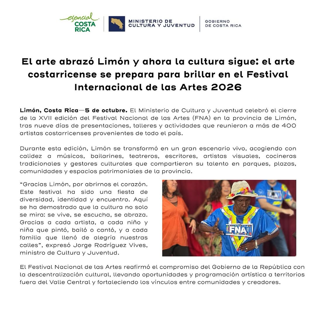 El Ministerio de Cultura y Juventud (MCJ), a través del Centro de Producción Artística y Cultural (CPAC), invita a artistas, colectivos y agrupaciones culturales de todo el país a participar de la convocatoria del XVII Festival Nacional de las Artes (FNA2025)