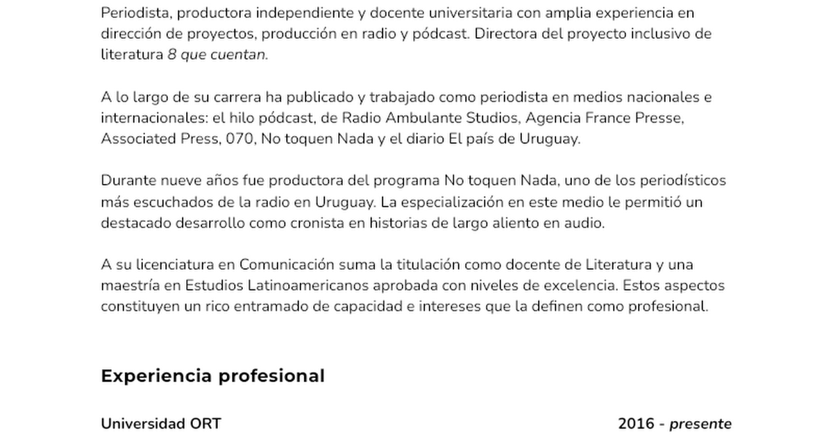 Periodista, editora y docente universitaria uruguaya especializada en sociedad y actualidad, con más de 15 años de experiencia en redacción, edición y producción periodística. Prensa escrita y podcast. Siempre mirando América Latina. Aquí parte de mi trabajo.