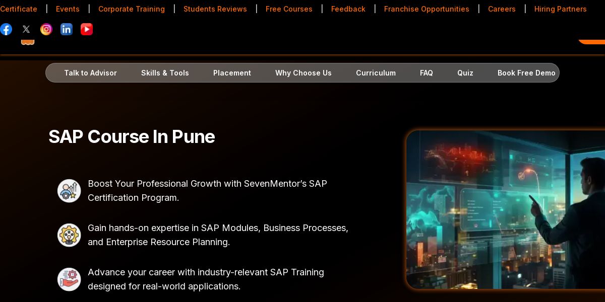SevenMentor is a recognized training institute in Pune with solid infrastructure, updated SAP courses, and support services. Reviews are mostly positive about teaching quality and organizational culture.