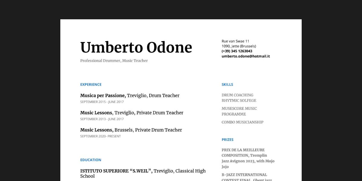 I obtained a bachelor degree in Jazz Drums at the “Luca Marenzio” Conservatory in Brescia. I then moved for master's studies to Brussels, where I graduated cum laude from the Koninklijk Conservatorium.