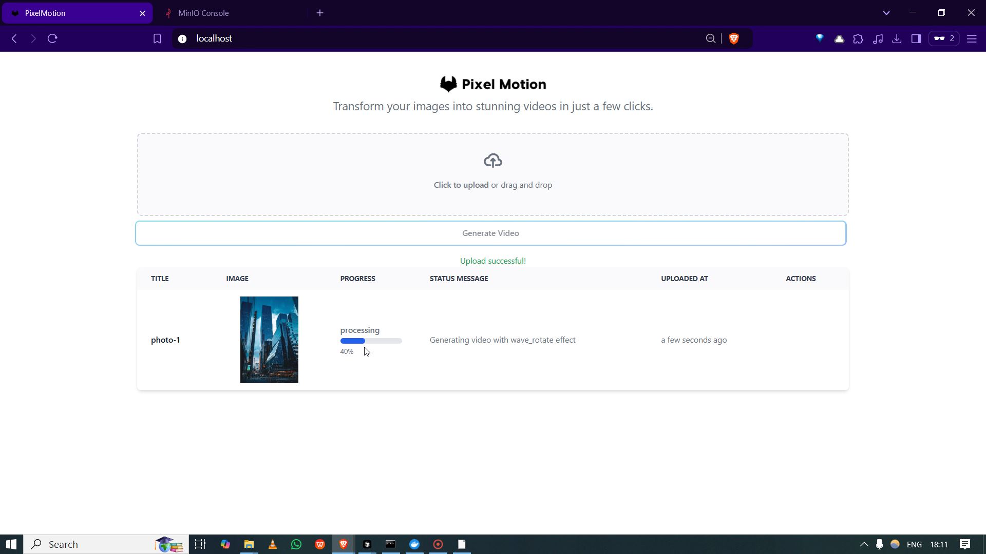 PixelMotion - React, TailwindCSS, FastAPI, Redis, Redis Queue, Docker, WebSockets
